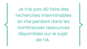 Lors d’un atelier sur l’usage de l’IA, le contenu vu en formation m’a permis de mieux structurer l’atelier. Je n’ai pas dû faire des recherches interminables en me perdant dans les nombreuses ressources disponibles sur le sujet de l’IA*.