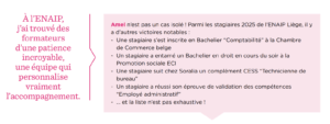 Amel, 43 ans, raconte son parcours au sein de l’ENAIP Liège avec enthousiasme et gratitude. Un parcours volontariste, clairvoyant… mais aussi accompagné par des professionnels très engagés.